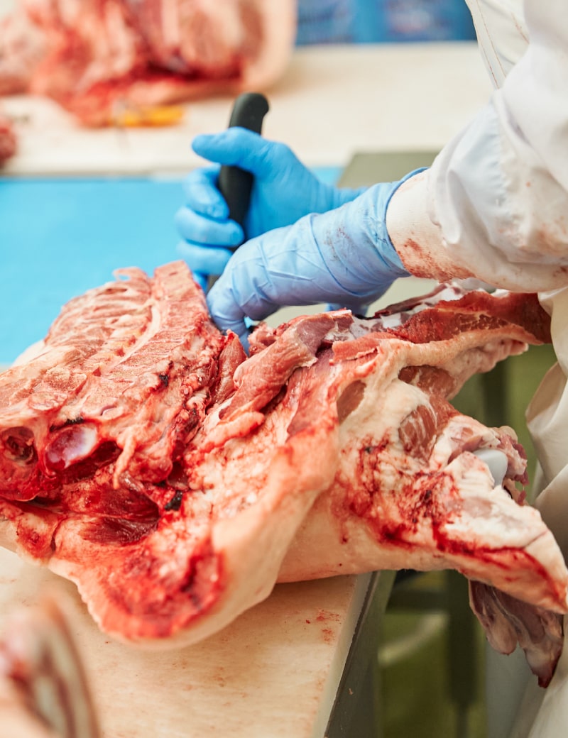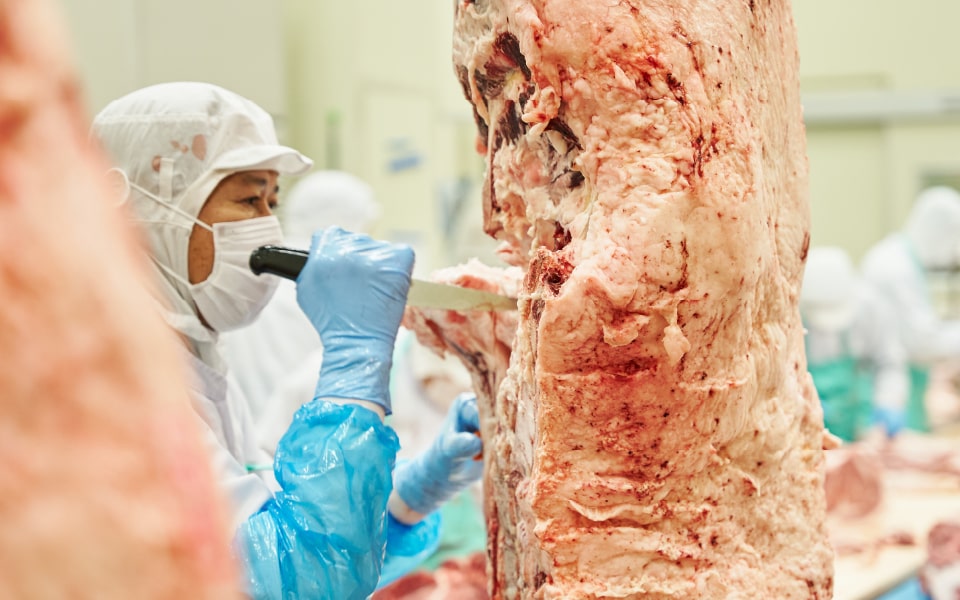 センターに入荷した「枝肉」をお客様ごとのご要望に合わせて加工いたします。衛生・鮮度などの品質管理を徹底した工場にて、素早く丁寧に取扱いしております。